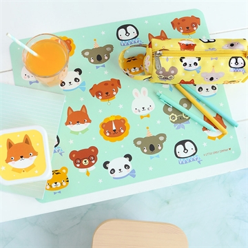 Vinyl underlägg med sött Animal Friends tryck. Bordstabletten är både funktionell och praktisk och kan användas vid måltider eller under kreativa aktiviteter. Bordstabletten har en halkfri baksida som ger extra säkerhet så att den ligger stabilt på bordet.