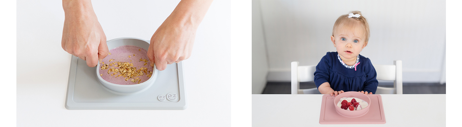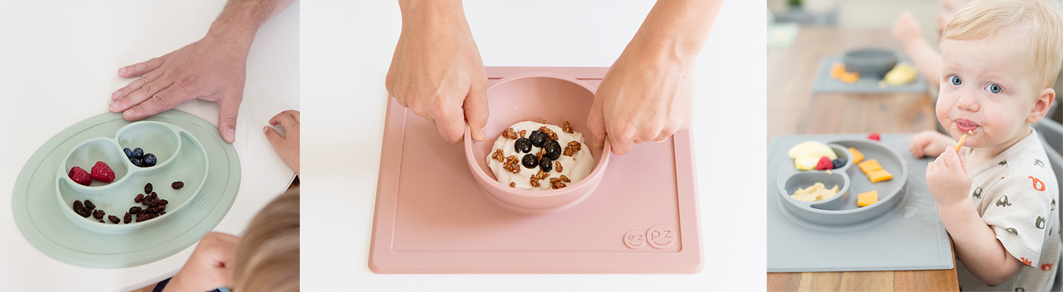 Ezpz är en innovativ allt-i-ett silikonplatta och bordstablett med 100% silikon. De smarta silikonplatta är utformade för att hålla sig på bordet så att barnet inte kan tipa den från bordet. Designad och utvecklad av Lindsey Laurain från Colorado i USA, som saknade något smart och användbart för måltiderna för hennes 3 pojkar, och vupti hon hade byggt grunden för ezpz. Absolut fri från BPA, Phatalates, PVC, samt färg och sprickskydd. Ingen bakterieformning. Ser bra ut även efter långa perioder. Diskmaskin, mikrovågsugn, ugn upp till 170 grader och frysning till -18 grader. Ezpz Happy Mat är utformad för att servera maten i 3 delade rum som stärker och stimulerar barnets självhushåll. Designen gör det möjligt för maten att serveras på ett myller av roliga sätt, så att barnet också är visuellt stimulerat att äta nya och roliga rätter. Ezpz Happy Bowl är utformad för att bland annat servera gröt, youghurt, mos, soppa, spaghetti sås, etc., och avstämd för att passa en normal storlek för ett litet barn. Gör det roligt och enkelt att betjäna en mängd roliga och kreativa lösningar. Ezpz Mini Mat och Mini Bowl är utformad för att passa de flesta barnstolar, och är lätt att ta med på resan eftersom den fyller minst. Alla varianter kan enkelt staplas med och utan mat, och är praktiska att bära även med varma rätter.