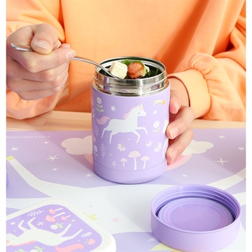 Dubbelväggig behållare i rostfritt stål för att hålla maten varm eller kall. Med skruvlock och ml-mått på insidan. Tar minimalt med plats.Specifikationer: